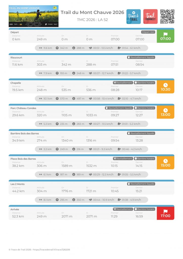 • Arrivée 52 km – Barrière horaire 17h00